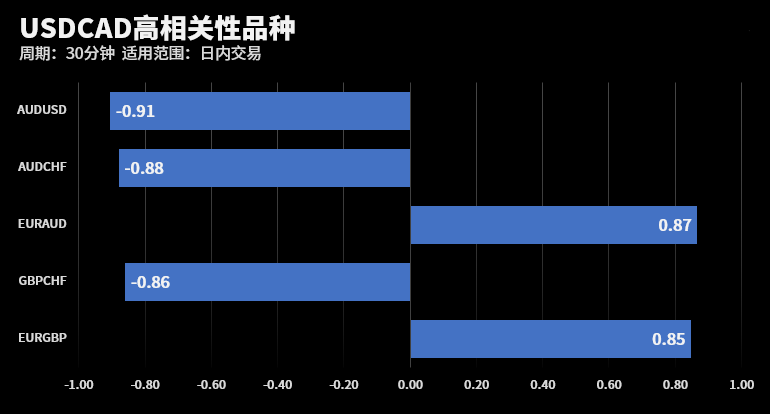 根据外汇相关性实时追踪,USDCAD在30分钟周期下与部分货币的相关性排行如下图: