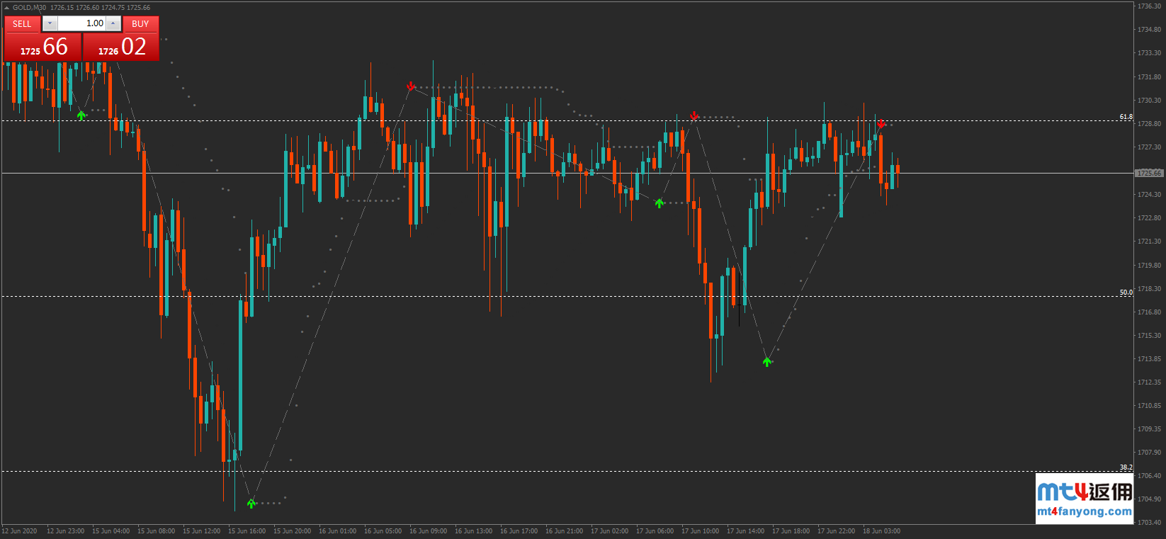 图为黄金30分钟走势图,金价突破下降通道上轨,目前正测试斐波那契61.8%回调位1728.49附近阻力,突破后后市或将进一步看涨至斐波那契78.6%回调位1735.02。