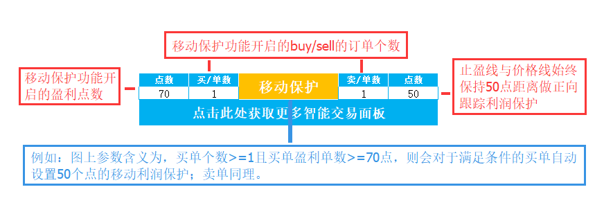 移动保护程序化交易面板,是一种对订单利润进行逐一移动跟踪保护的利润保护按钮化交易工具,灵活便捷,最大化的保护订单利润!它可以根据用户的需求灵活的调整利润保护点数,以及开启该项功能的持仓数。不止做到只要订单有利润,就不亏损离场,而且移动式最大化的保护每一张订单的利润。