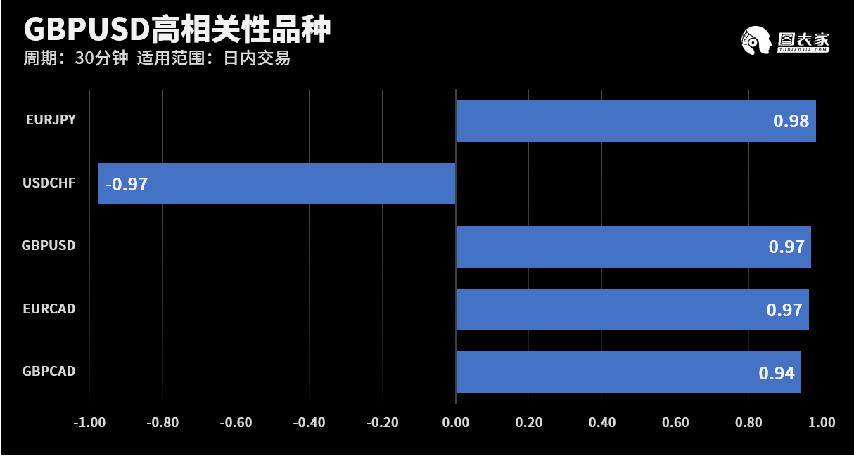 根据外汇相关性实时追踪,GBPUSD在30分钟周期下与部分货币的相关性排行如下图: