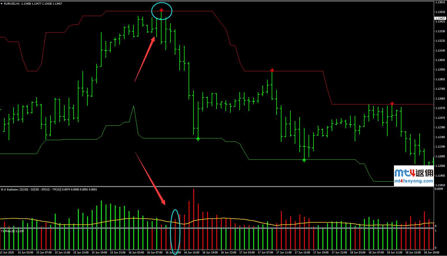 主界面出现红色箭头,W.A Explosion指标出现红色柱子,T3 2ColorHisto指标出现红色柱子,可以入场做空