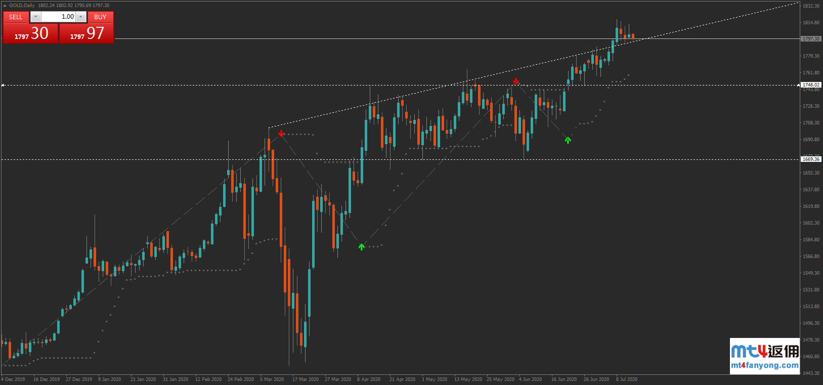 图为黄金日线走势,价格短线回调,但维持在4月以来的高点组成的支撑线哈10日均线构成的共振支撑之上,该支撑目前在1795附近,因此预期价格上行压力依然较大,上涨目标见斐波那契161.8%延展位1859。