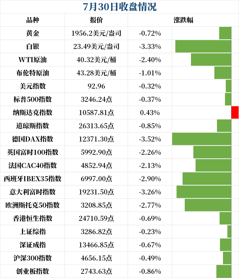 股市方面,美国第二季度GDP大跌32.9%,创上世纪40年代以来最大跌幅,加上初请人数连续两周回升,市场忧虑美国经济再陷入危机,道指低开约200点,截至收盘,道指收跌0.85%,纳斯达克指数涨0.43%,道琼斯指数跌0.85%。