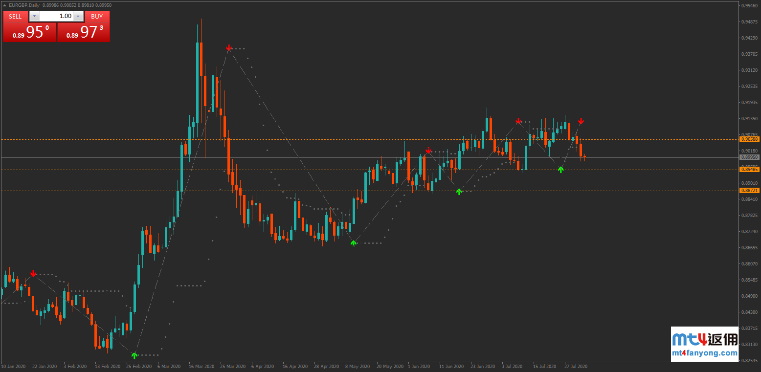 欧元/英镑近期的走势有所放缓,该货币对已经有超2个月的时间都维持在0.9000关口附近震荡。上周价格再度触及0.9000关口。