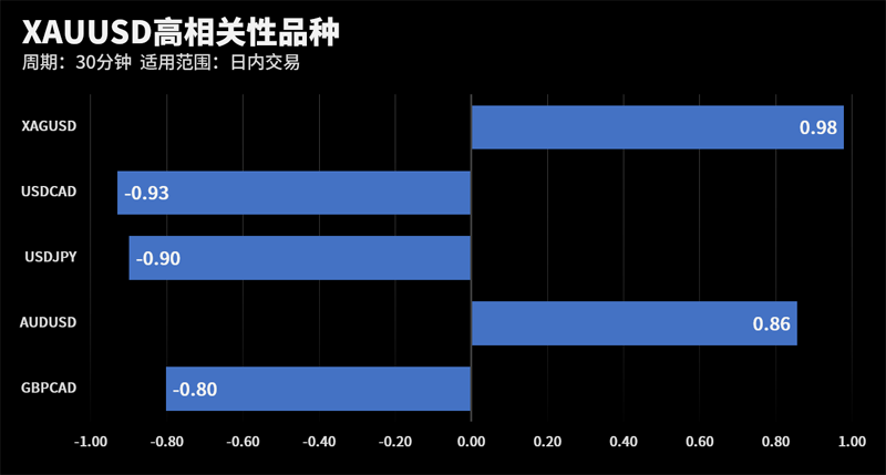 根据外汇相关性实时追踪,XAUUSD在30分钟周期下与部分货币的相关性排行如下图: