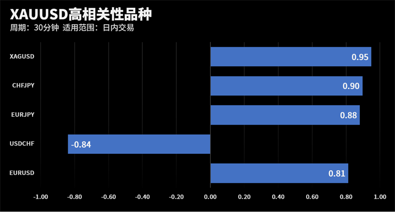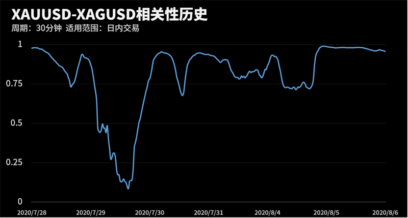 根据外汇相关性实时追踪,XAUUSD和XAGUSD在30分钟周期下相关系数达到0.95。