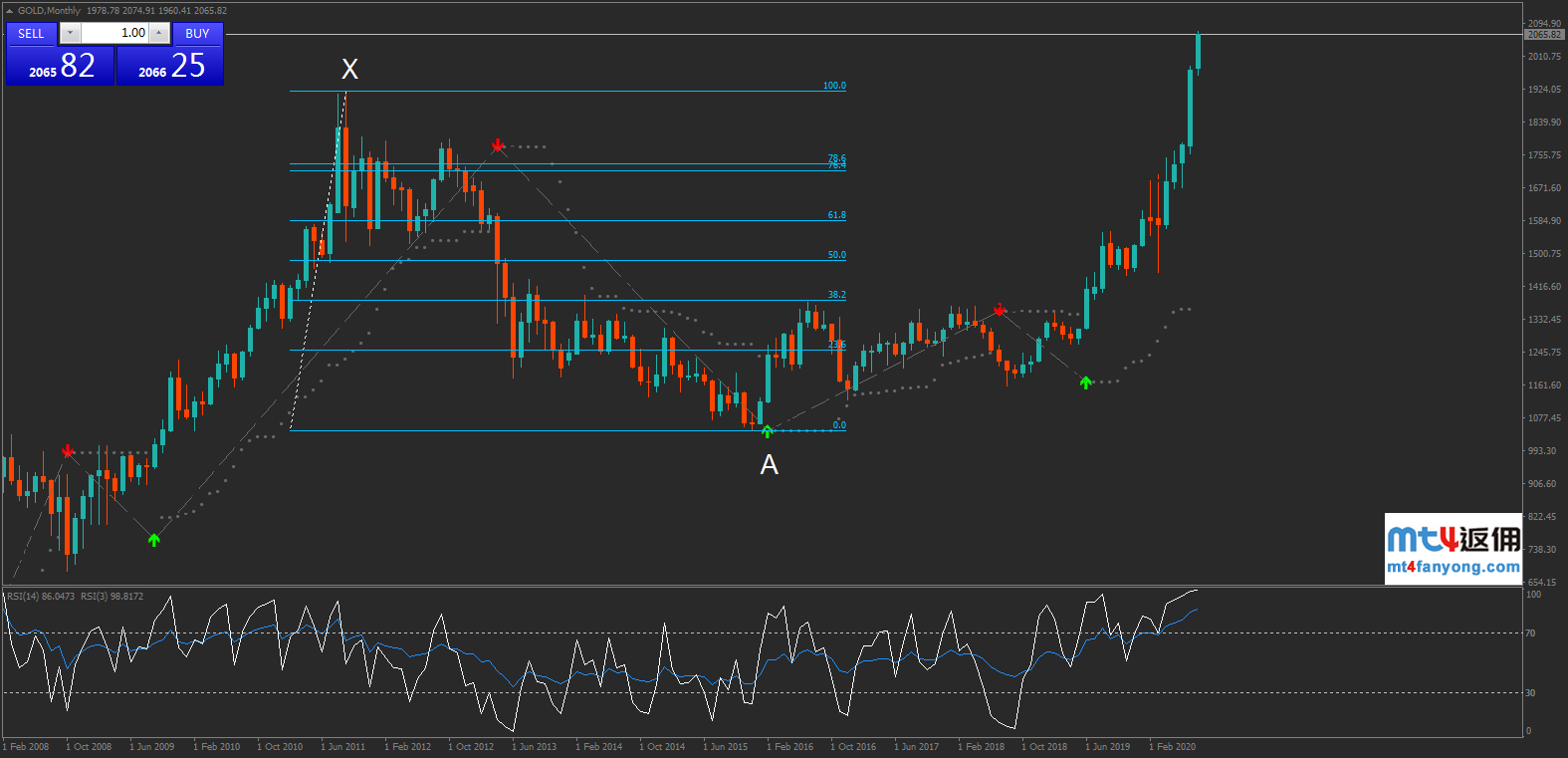 黄金的月线图表形态显示,价格于2012年5月下探1046(A点)后启动大牛市,于2020年7月突破此前的历史高点1921(2011年9月高点,X点)后频频创纪录新高,目前企稳2050水平。