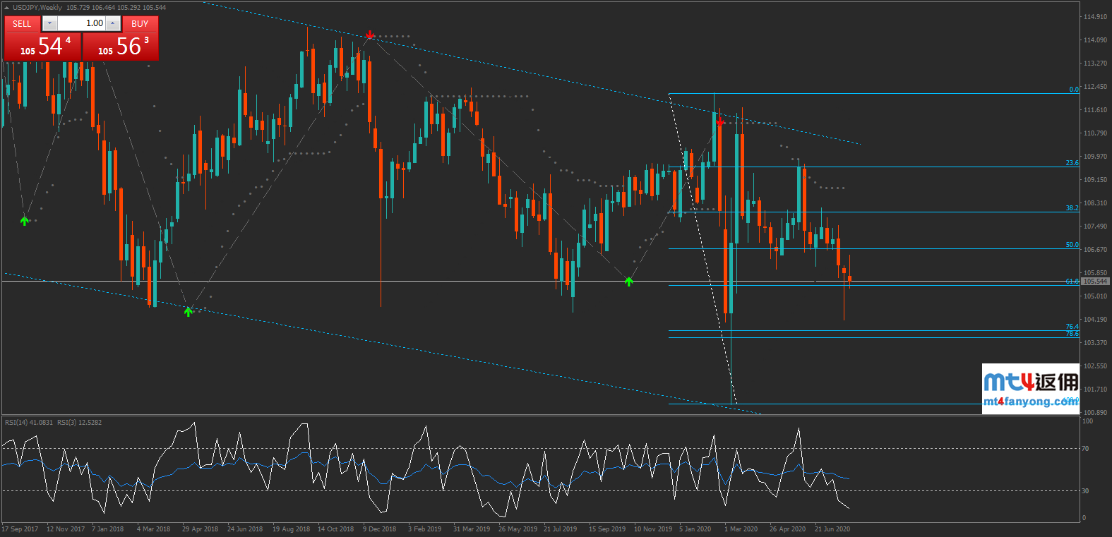 初步周度阻力位于2019年10月的低点106.48。中期看跌策略失效水平现下调到107.69(6月跌势的61.8%斐波回撤位)——后市聚焦价格在此处会否有上行势头疲软迹象。初步支撑持稳在105.20(3月那波升势的61.8%斐波回撤位)。美元/日元收盘需跌破104.12才有可能令长线看跌观点持稳,这种情形下美元/日元后续可能跌向103.43(78.6%斐波回撤位)。
