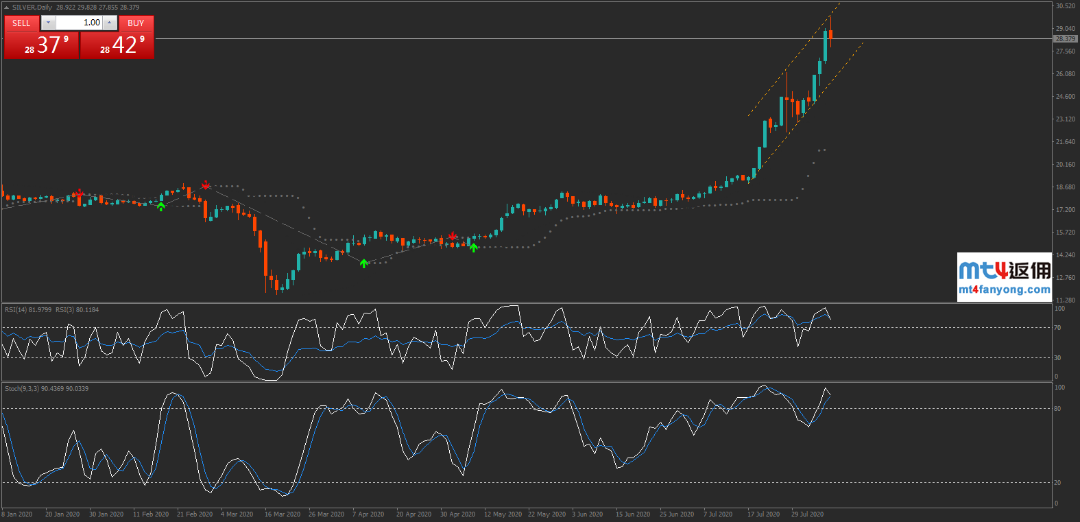 白银的日线图表形态显示,价格维持在近期的上行通道内不断走强,并在升穿26.20压力后进一步扩大涨幅,一度逼近28关口。