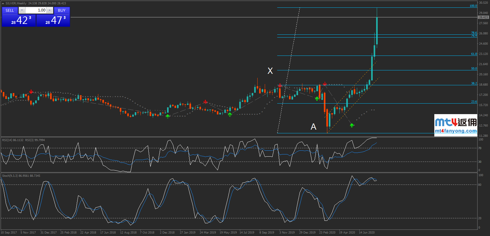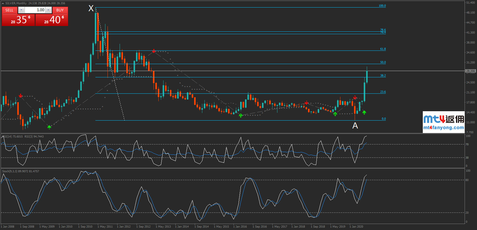 白银的月线图表形态显示,价格于2020年3月刷新逾11年低点11.64(A点)后止跌反弹,短短数月暴涨约140%,并一度逼近28关口。