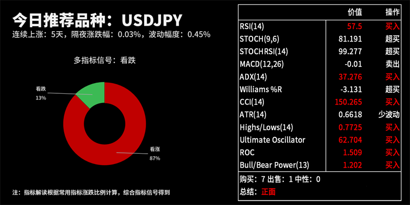 美元日元(上涨:5天,隔夜涨跌幅:0.03%,波动幅度:0.45%。