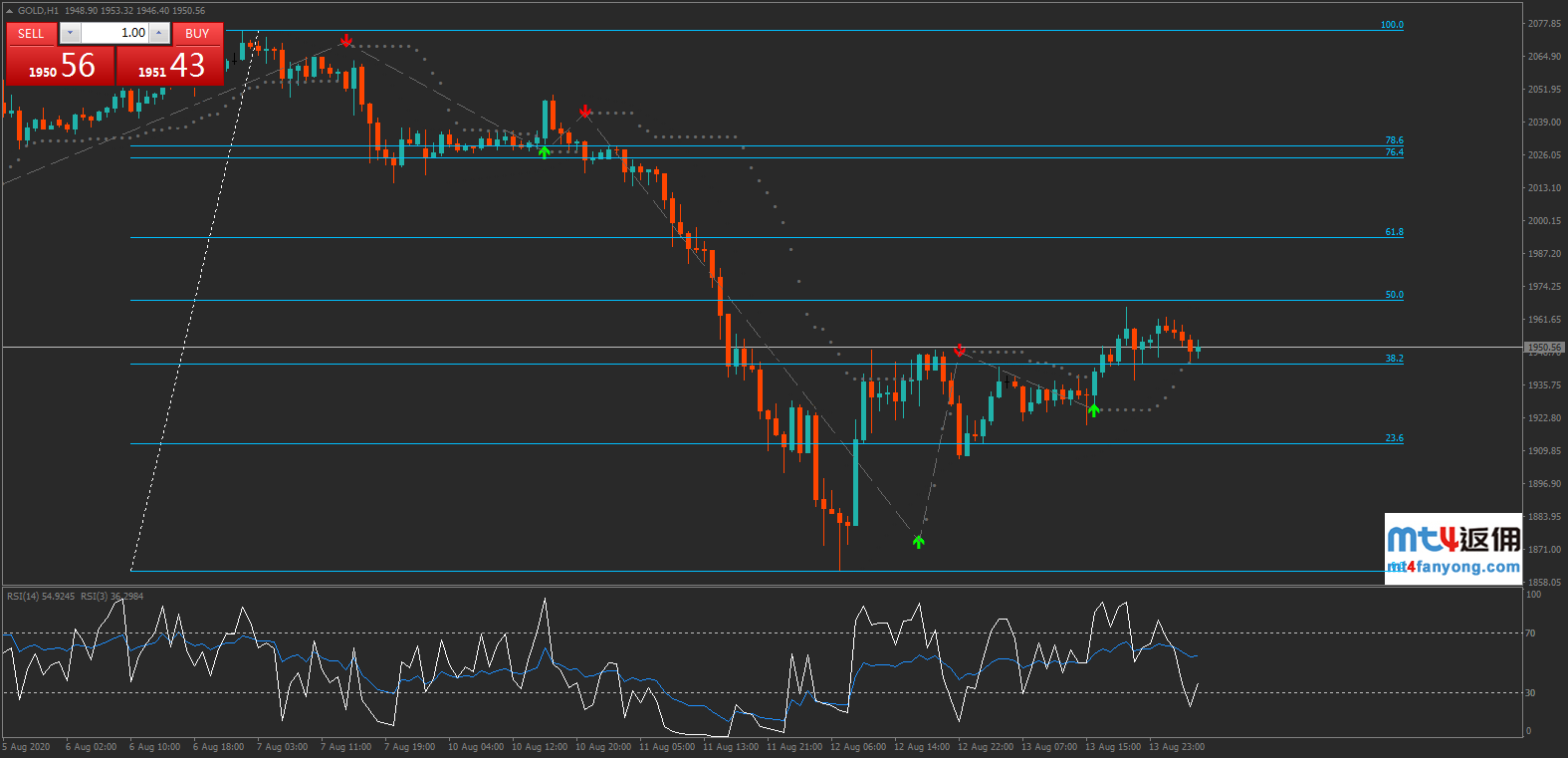 黄金日线走势,价格测试上升通道下轨支撑后反弹,已经突破斐波那契23.6%回调位1929水平,若价格进一步上涨,上方阻力见2000关口。