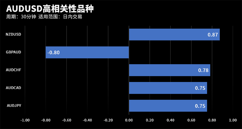 根据外汇相关性实时追踪,AUDUSD在30分钟周期下与部分货币的相关性排行如下图: