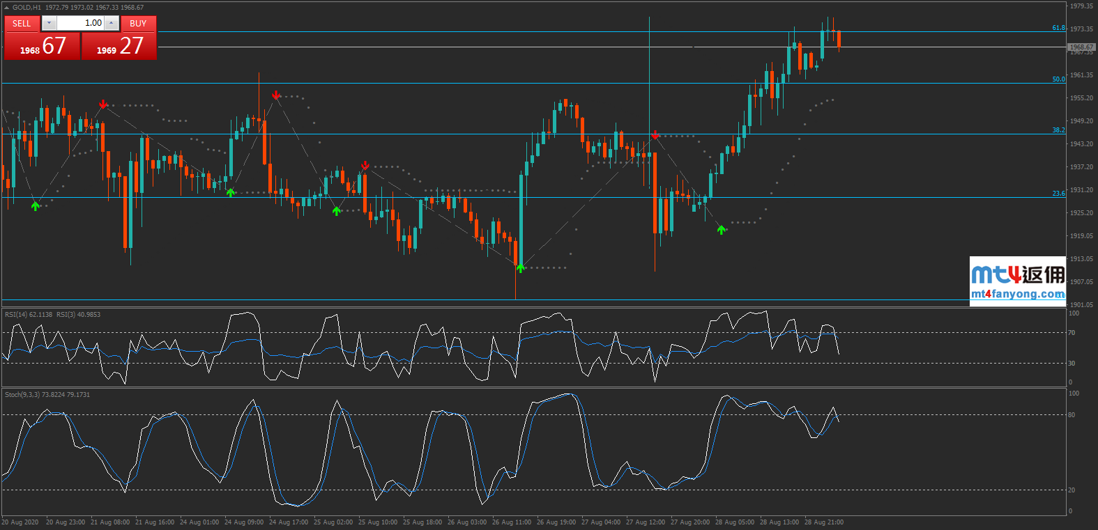 图为黄金1小时走势图,金价早盘走高,目前正测试斐波那契61.8%回调位1972.48附近阻力,若金价继续上行,短线或将看涨至斐波那契78.6%回调位1991.41附近,突破后进一步阻力位见前高2015附近。