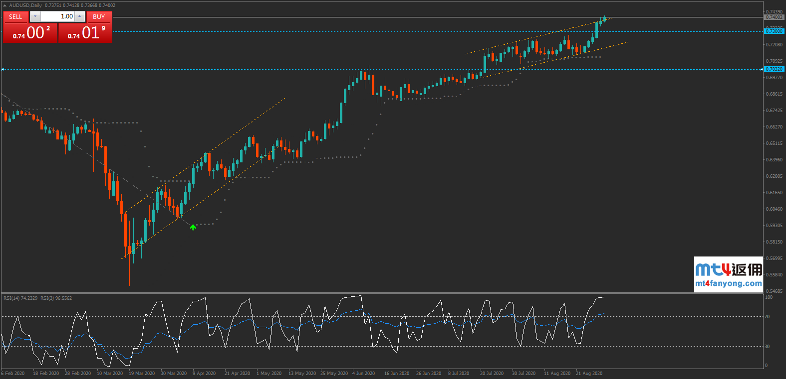 4小时图上,RSI出现背离,暗示汇价上涨动能可能正在减弱,若澳元/美元回落,则下方支撑看向始于8月底阶段性低点以来的上升趋势线(图中蓝色趋势线),下破该趋势线则下方关键支撑看向0.73关口。反之,若背离宣告失效RSI继续向上攀升,则澳元/美元可能会加速上涨,上方目标看向0.7500/73。