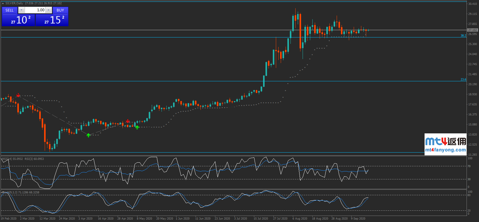 反之,只要银价守住26.00一线支撑,则多头可能重新得到投资者的喜爱,使得银价上涨并努力测试8月水平,或者至少努力回升至心理水平28.00一线。
