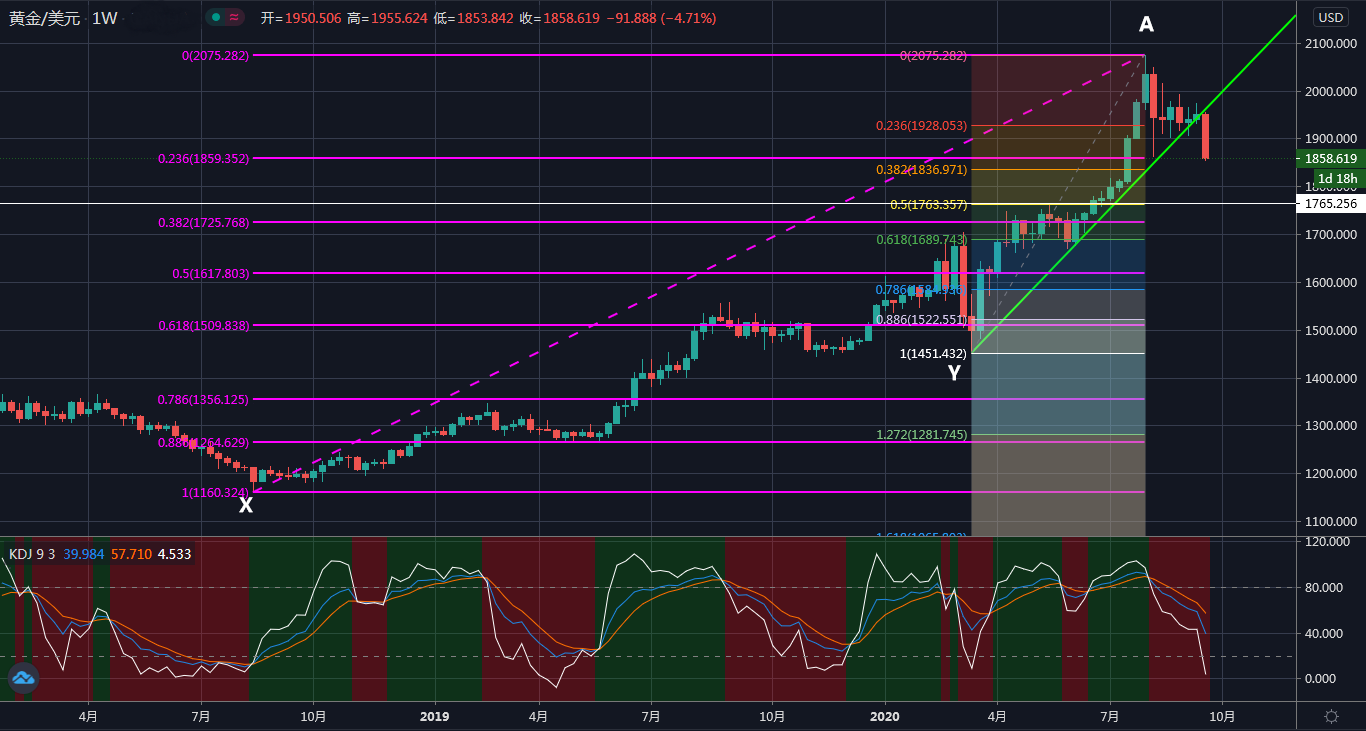 黄金的周线图显示,价格于2018年8月13日当周触及1160(X点)后筑底反弹,至2020年8月3日当周创下历史高点2075(A点),随后行情明显回撤,并跌破2020年3月16日当周低点1451(Y点)以来的上行趋势线。与此同时,K线出现长阴形态,表明空头动能相当充足。