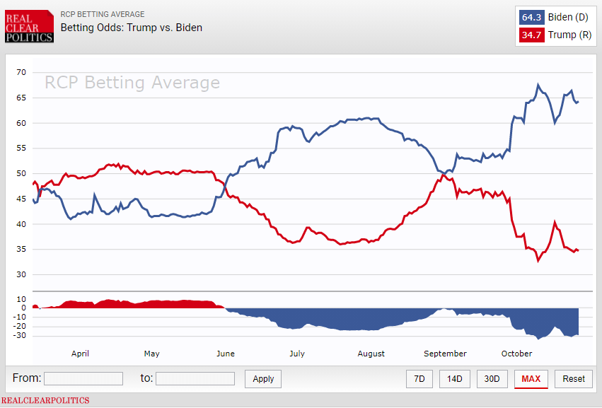 距离美国大选仅剩不到一周的时间。市场波动性开始升高,但这似乎并非与政治相关的因素导致的,而更可能是疫情新增病例大增的缘故。笔者将稍后讨论这一点。目前,两位候选人的赔率和不同机构的民调数据均认为民主党候选人拜登将获胜,而现任总统特朗普则落后于他的对手。