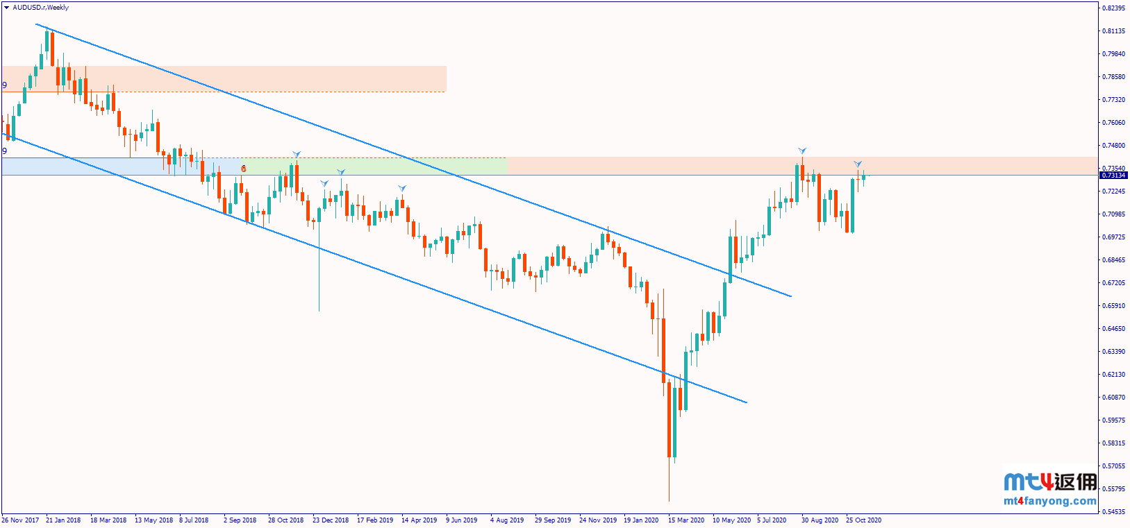 周线支撑位关注202/2019年开盘水平0.7016/42,若跌破该区间则下方目标看向2016年低点0.6827和关键支撑位0.6660/84(2008年低点当周收盘价/2019年低点/38.2%斐波回撤位)。
