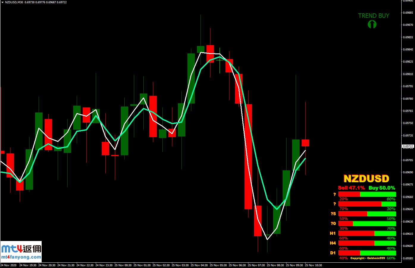 均线呈多头排列,不同周期多空能量对比指标-BUY百分比大于SELL百分比,有“TREND BUY”提示。