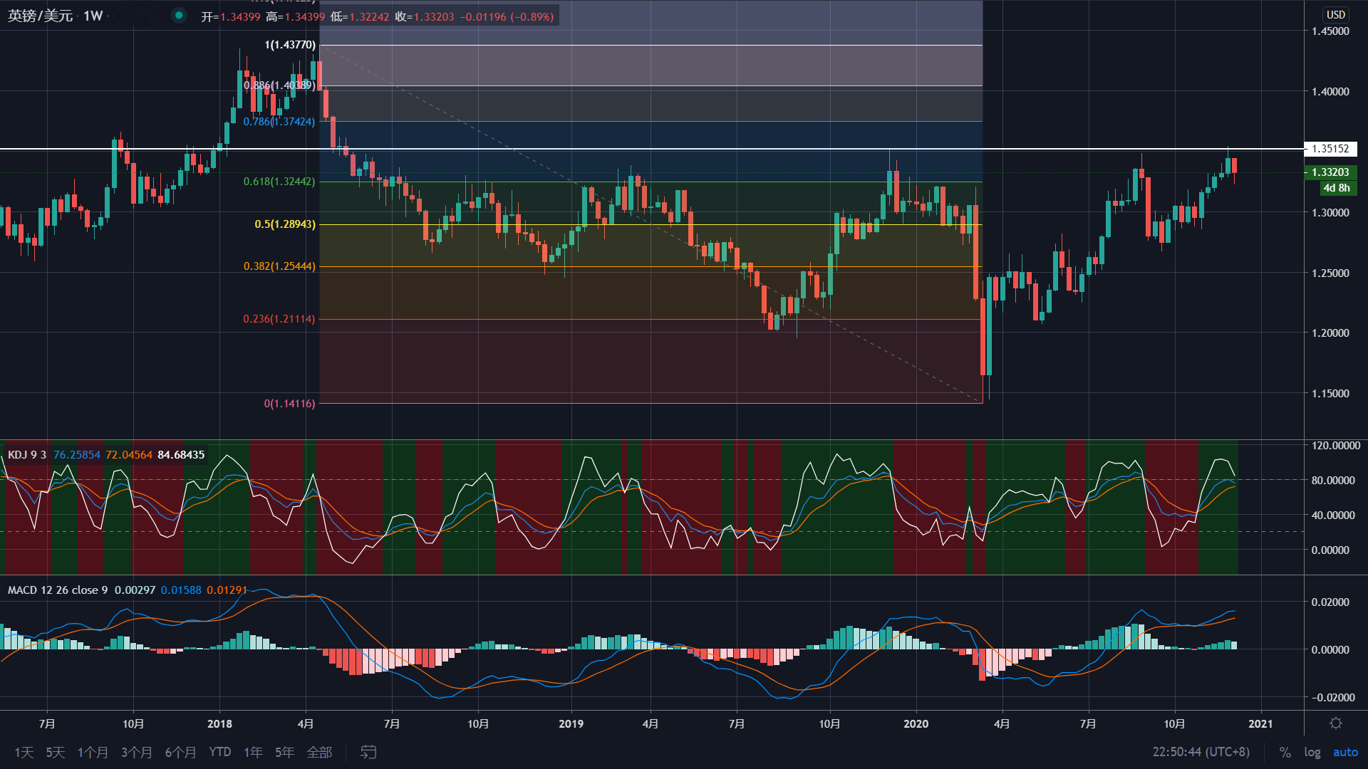 周线:未能有效涨破1.3500附近的压力平台