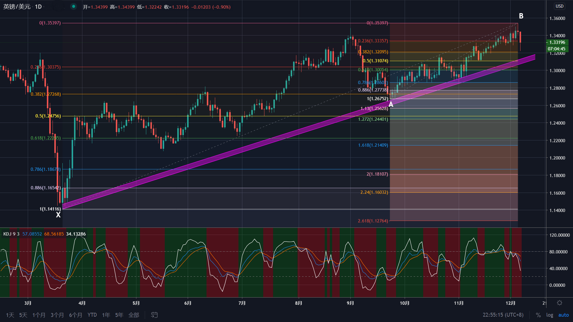 英镑/美元的日线图显示,3月20日,价格触及1.1412(X点)后持续走强,至12月4日最高触及1.3540(B点)后回落,当日录得长上影十字星。12月7日,价格一度暴挫逾200点至1.3224,随后反弹逾百点至1.3330附近。