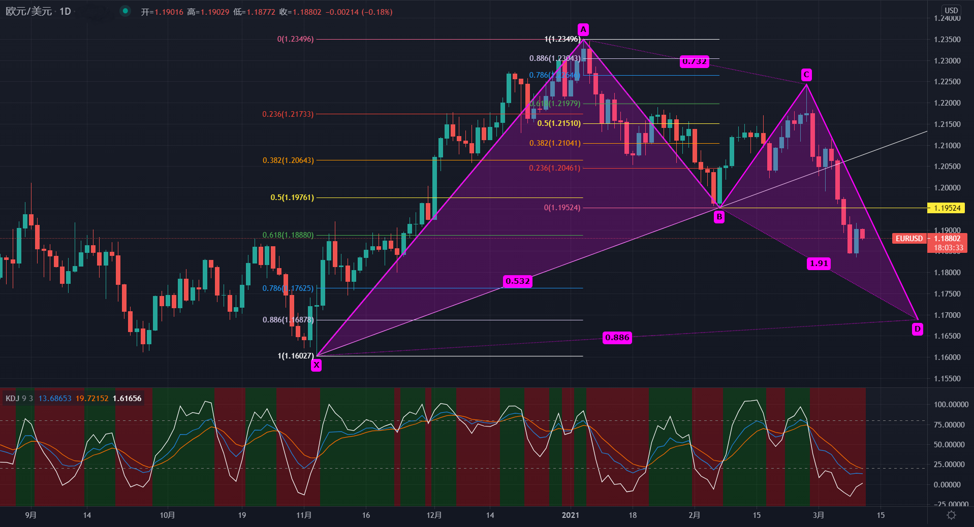 下方可关注1.1836、1.1762(0.786XA)、1.1688(0.886XA)等支撑,尤其是1.1688,此位置是一个潜在蝙蝠模式的理想收敛点,若价格在该水平附近获得支持,则不排除构成看涨蝙蝠模式: