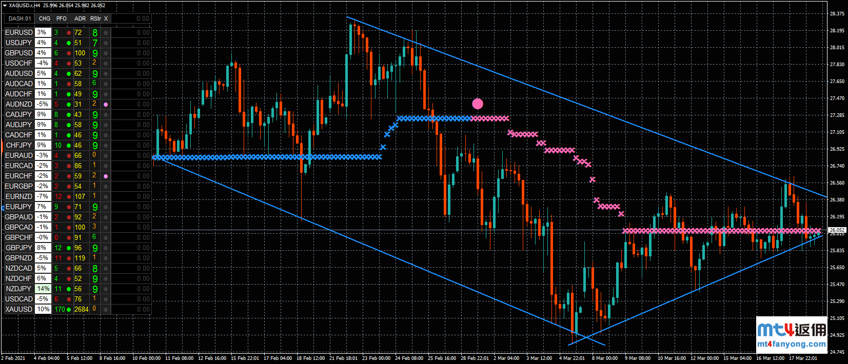 从4小时图来看,白银价格从近期低点的反弹行情并不是令人十分鼓舞。事实上,这段时间的走势为白银价格构筑了一个上升楔形形态。