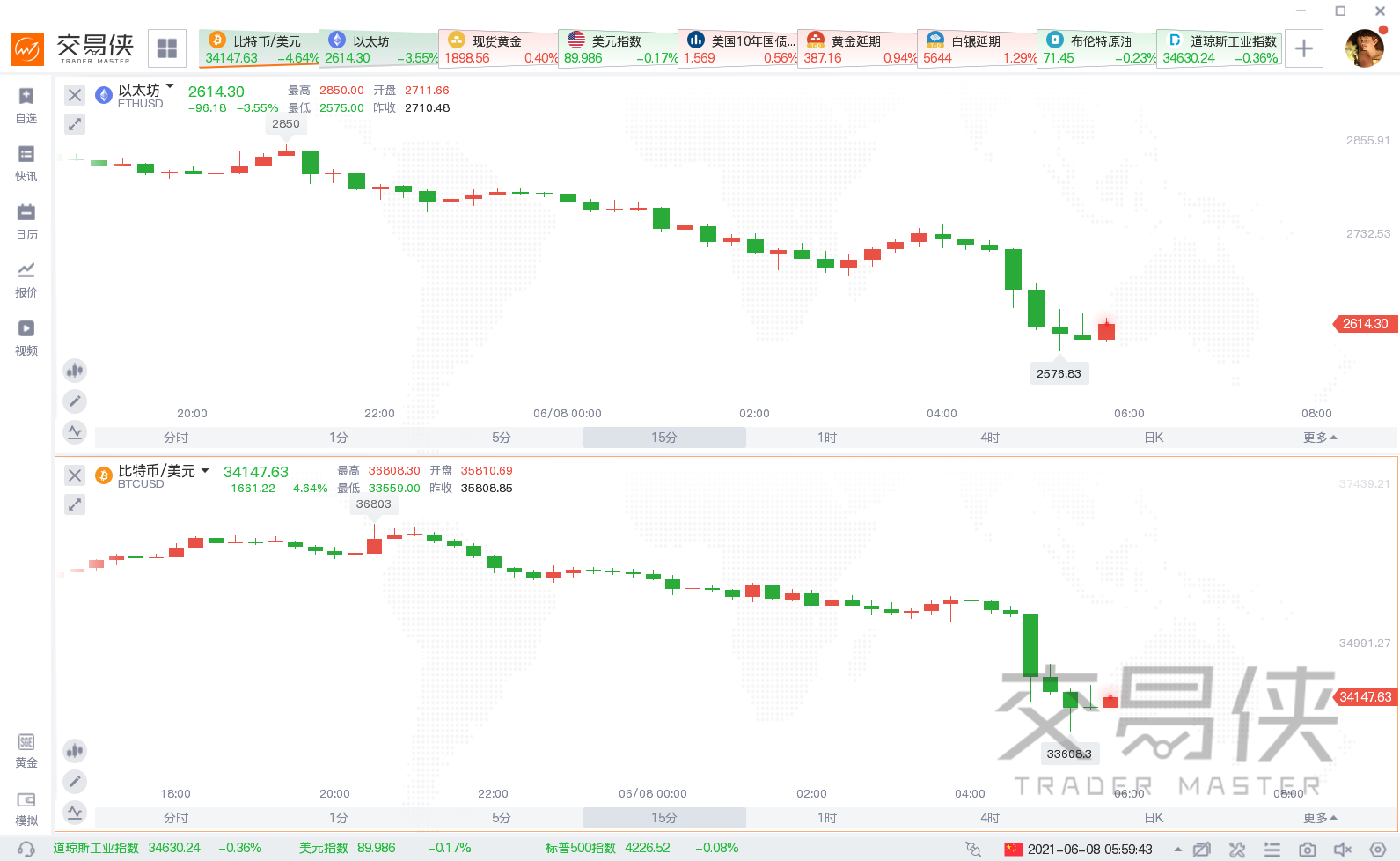 MicroStrategy将发行4亿美元债券以购买更多比特币的消息影响,比特币周一(6月7日)日内曾逆转周末颓势小幅走高,然而北京时间周二(6月8日)凌晨05:15左右,比特币突然跳水,数分钟内跌超2000美元,下破34000美元/枚,日内跌超5%。同时,以太坊跌破2600美元/枚。