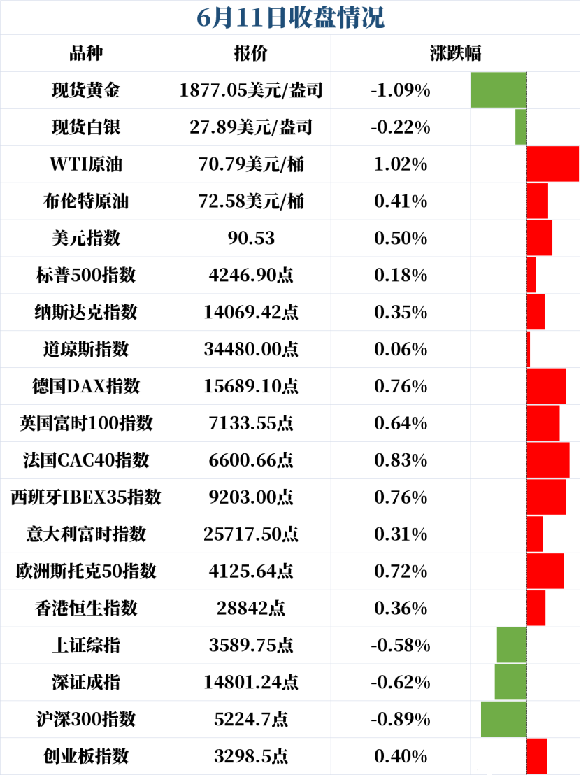 美股方面,上周五三大股指集体收涨,其中纳指收涨0.35%,报14069.42点;道琼斯指数收涨0.04%,报34480.00点;标普500指数收涨0.18%,报4246.90点。
