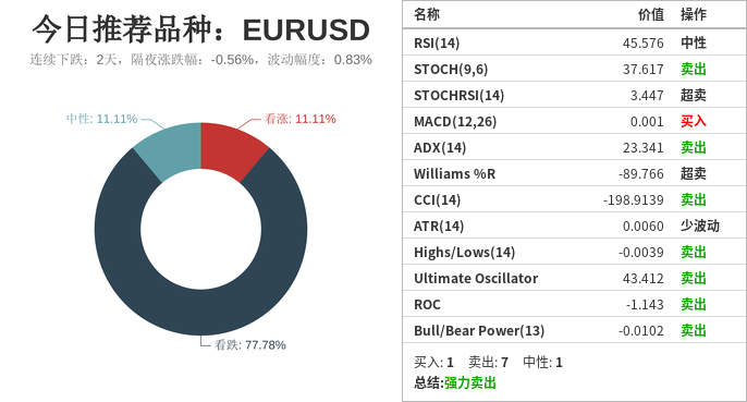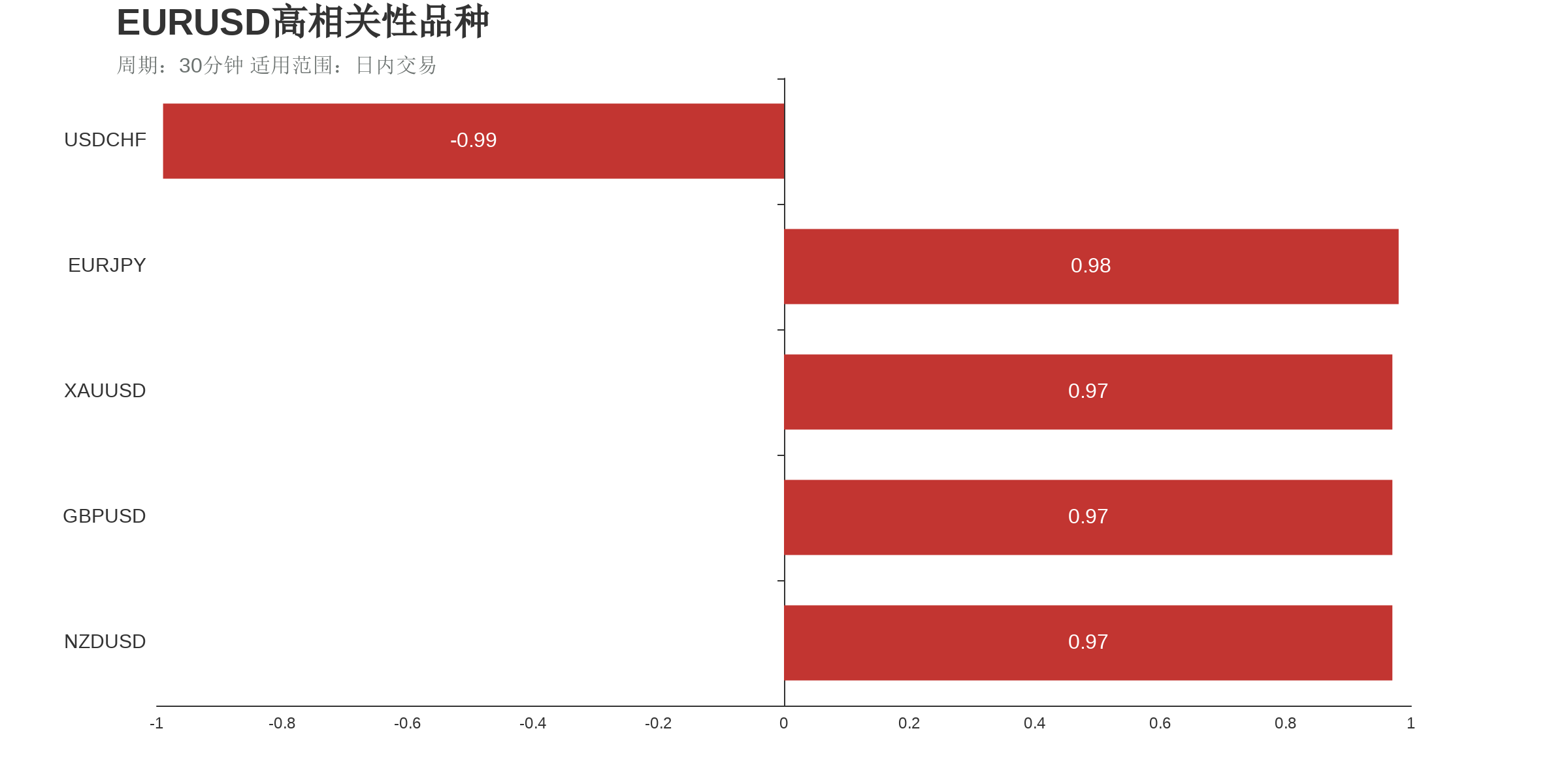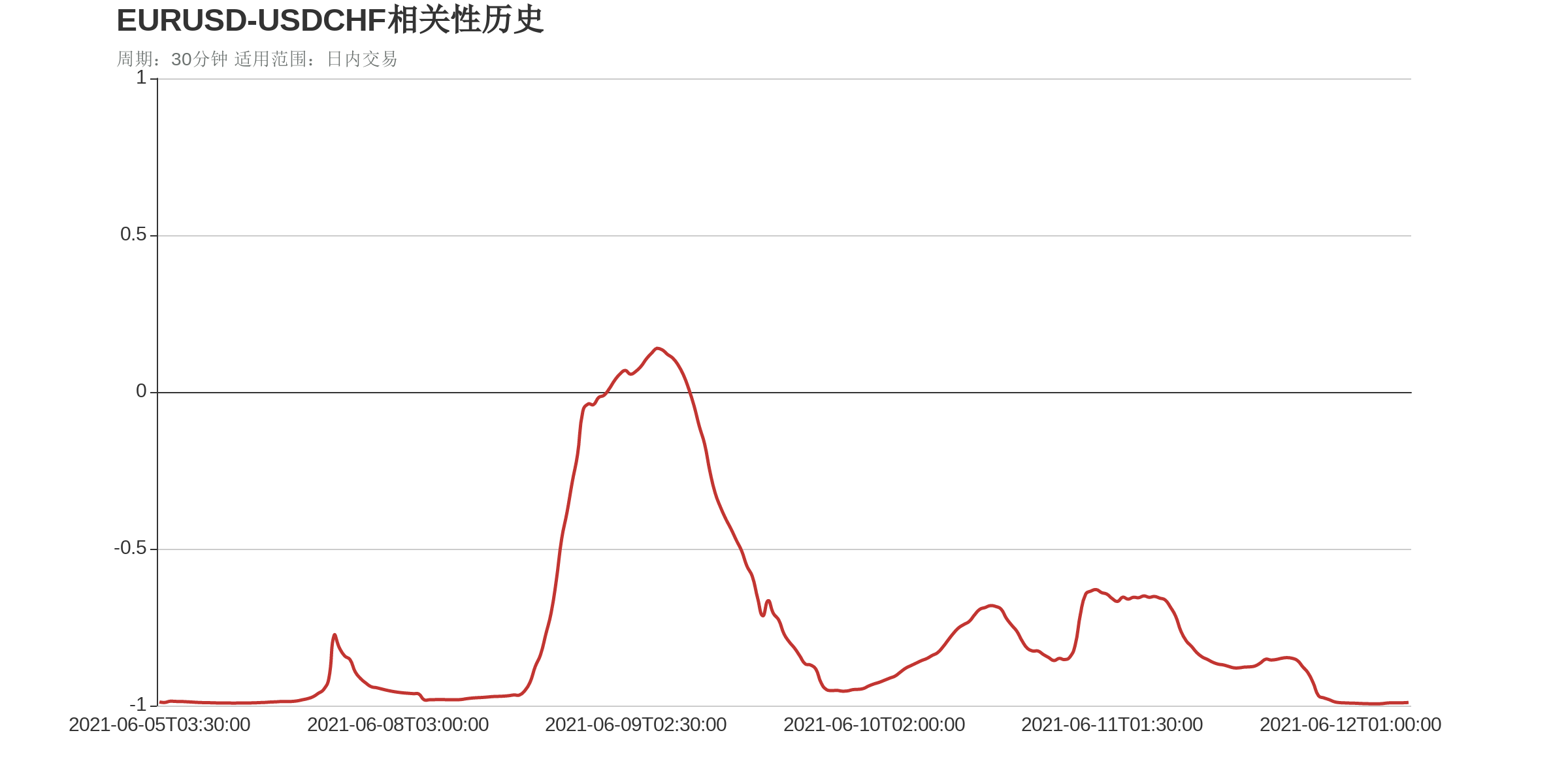 市场研究所 | 2021年6月14日 作者: MT4返佣网 2021-06-14 13:42 108 日内推荐交易品种及相关策略: 欧元美元(下跌:2天,隔夜涨跌幅:-0.56%,波动幅度:0.83%)。 根据外汇相关性实时追踪,EURUSD在30分钟周期下与部分货币的相关性排行如下图: 其中,EURUSD和USDCHF在该周期下相关系数达到-0.99,对投资者提出如下建议: 做多/空1标准手EURUSD的同时,做多/做空1标准手USDCHF,或者反向做空/做多1标准手EURJPY。 日内重要交易时间窗口: 17:00欧元区4月工业产出月率。