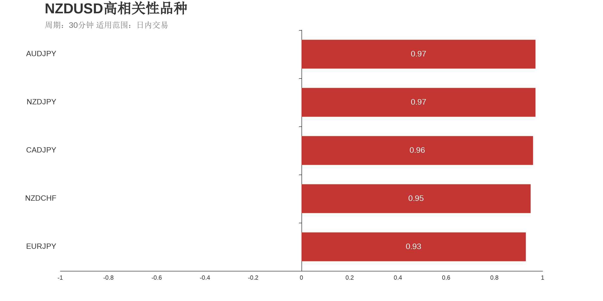 根据外汇相关性实时追踪,NZDUSD在30分钟周期下与部分货币的相关性排行如下图: