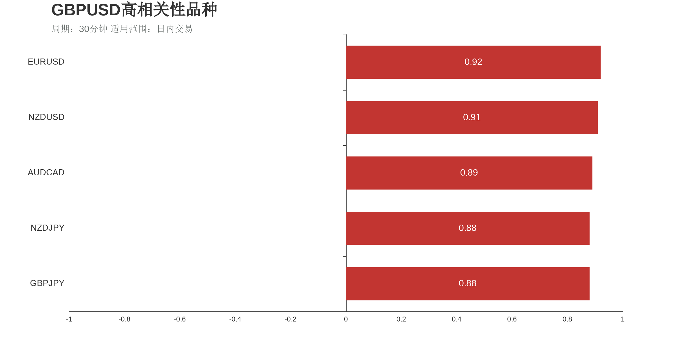 根据外汇相关性实时追踪,GBPUSD在30分钟周期下与部分货币的相关性排行如下图: