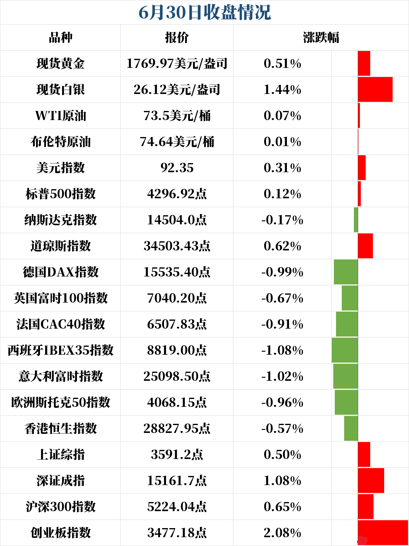 现货黄金日内由跌转涨,似乎没有受到小非农数据影响,一度站上1770关口,日内涨幅一度达0.57%,最终收涨0.51%,报1769.97美元/盎司。现货白银整体呈震荡上行趋势,一度站上26关口,最终收涨1.44%,报26.12美元/盎司。现货黄金2021年上半年收跌7.1%,现货白银收跌1.9%;现货黄金6月大跌逾7%,月度跌幅为2016年11月以来最大。