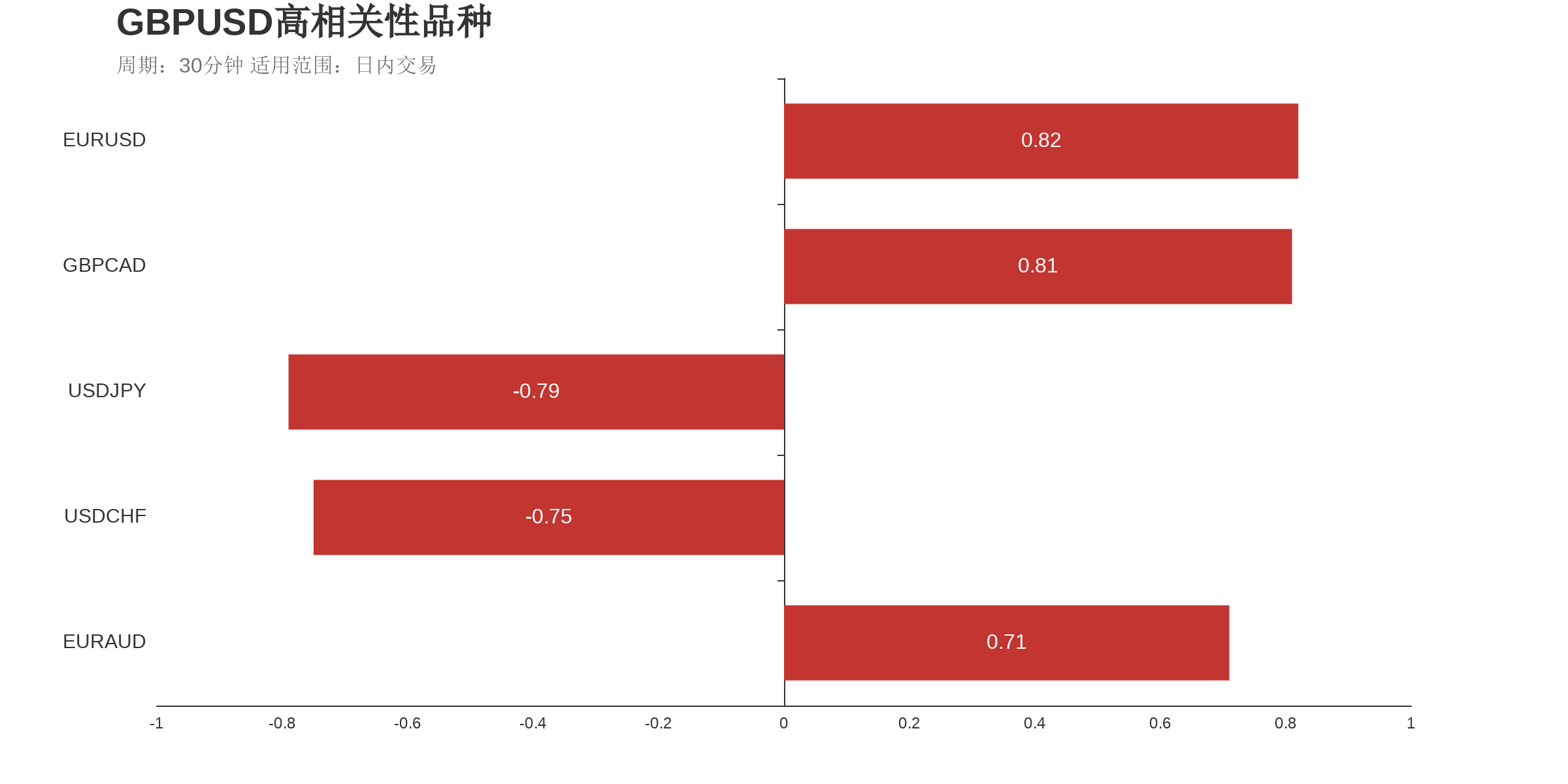 根据外汇相关性实时追踪,GBPUSD在30分钟周期下与部分货币的相关性排行如下图: