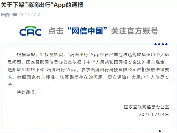 国家互联网信息办公室依据《中华人民共和国网络安全法》相关规定,通知应用商店下架“滴滴出行”App,要求滴滴出行科技有限公司严格按照法律要求,参照国家有关标准,认真整改存在的问题,切实保障广大用户个人信息安全。