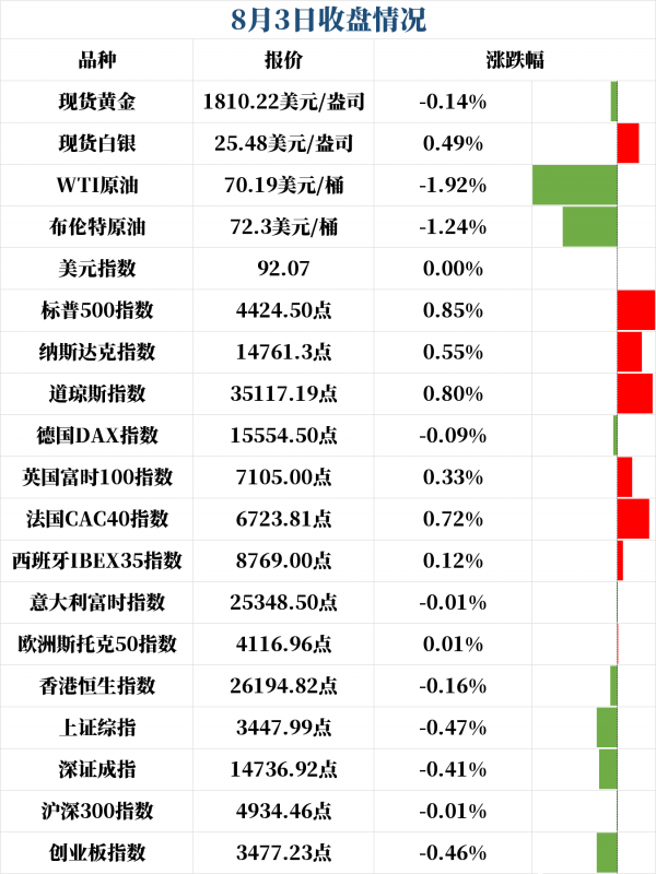 国际油价方面,WTI原油维持震荡格局,一度跌破70美元/桶,为7月22日以来首次。截至收盘,WTI原油收跌1.92%,报70.19美元/桶;布伦特原油收跌1.24%,报72.3美元/桶。