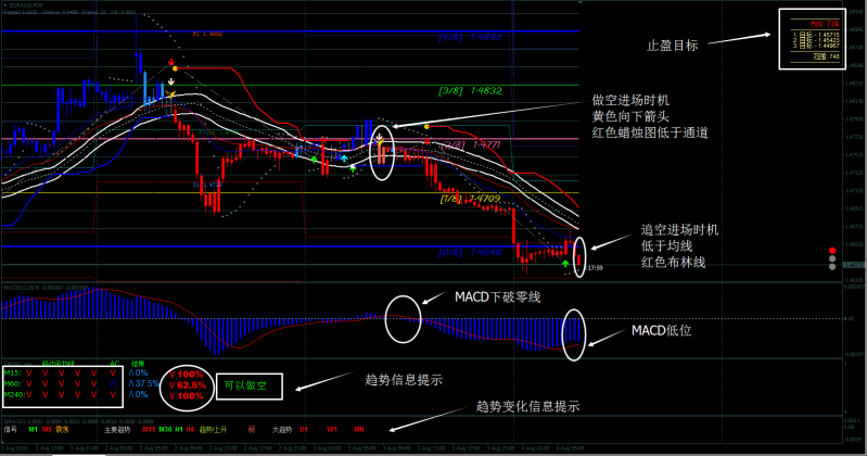 2. 做空时机:出现黄色向下箭头(追空时出现红色向下小箭头);红色蜡烛图下破白色均线通道(Channel)指标和移动平均线组合(MA)-(追空时需低于以上指标);MACD指标下破零线(追空时需低于零线);出现红色向下的布林线指标(Boll);趋势信息指标为红色且提示可以做空。