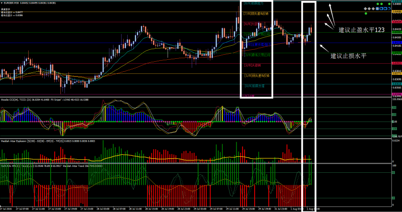 1. 做多时机:出现紫色蜡烛图(如果高于移动平均线组合最佳,不强制); 复合型CCI指标(Woodie CCI)多线上行(如果上破零线水平最佳,不强制),水平位出现绿点(必要条件)且动能柱转为蓝色(不强制);趋势强度指标(Waddah Attar Explosion)为绿色动能柱且上破黄线(如果之后黄线上行最佳);复合型随机指标(StoMAch)绿色双线上破黄线且出现绿色动能柱。趋势反转行情可参考复合型水平位指标的提示。