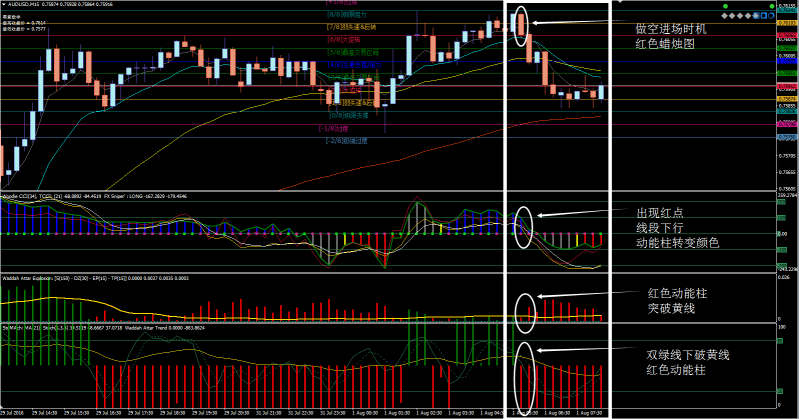 2. 做空时机:出现红色蜡烛图(如果低于移动平均线组合最佳,不强制); 复合型CCI指标(Woodie CCI)多线下行(如果下破零线水平最佳,不强制),水平位出现红点(必要条件)且动能柱转为红色(不强制);趋势强度指标(Waddah Attar Explosion)为红色动能柱且上破黄线(如果之后黄线上行最佳);复合型随机指标(StoMAch)绿色双线下破黄线且出现红色动能柱。趋势反转行情可参考复合型水平位指标的提示。