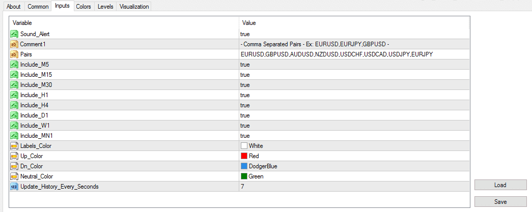 为了正确操作MTF MCP 3 Level Semafor Dashboard Alerts,必须另外安装Semaphor 3Level ZZ 指示器(存档中提供)。建议使用模板3_Level_ZZ_Semafor_Alert.tpl 安装(存档中有)。然后一切都会正常工作。 默认情况下,该指标在所有可用时间范围内显示8对(EURUSD、GBPUSD、AUDUSD、NZDUSD、USDCHF、USDCAD、USDJPY、EURJPY)的信息。 这可以在设置中更改: